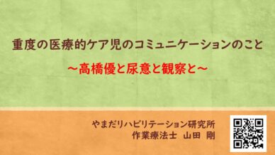 2025年 重度の医療的ケア児のコミュニケーションのこと ~高橋優と尿意と観察と~ エックスでも投稿したのですが、2025年11月にとある大学さんで講義をさせていただくことになりました。理学療法士や作業療法士などを養成する大学ではなく、まあ普通の大学かな。このブログのタイトルの講義を... 2025.09.19 2025年子供のリハビリとか児童デイのこと